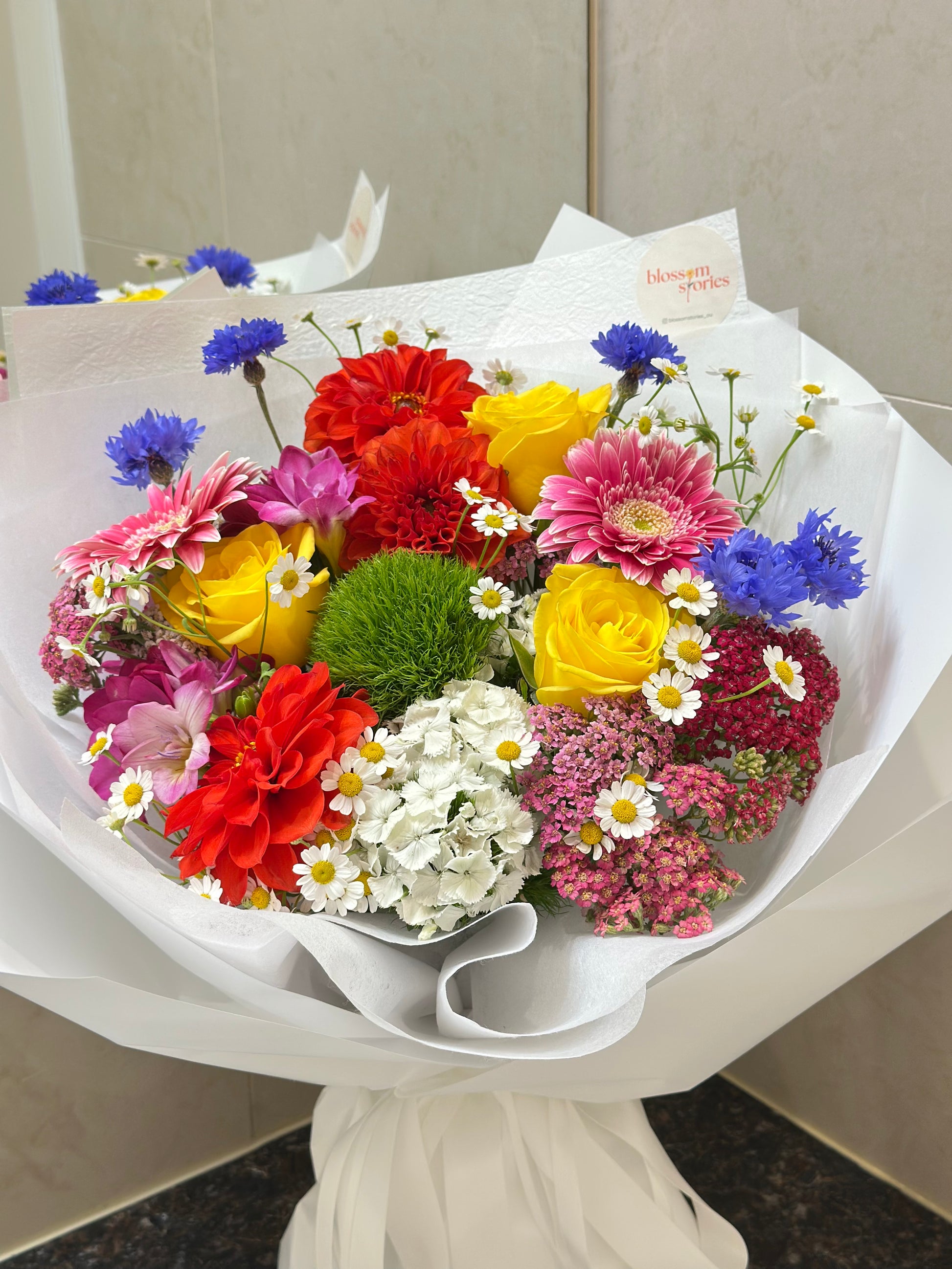 Bold, vibrant, and full of joy! This bright bunch is bursting with fresh seasonal blooms in the happiest colours—think sunshine yellows, fiery reds, and pops of cheerful colours. Whether you're celebrating something special or just want to add a little extra colour to your day, this bunch is pure happiness in floral form!