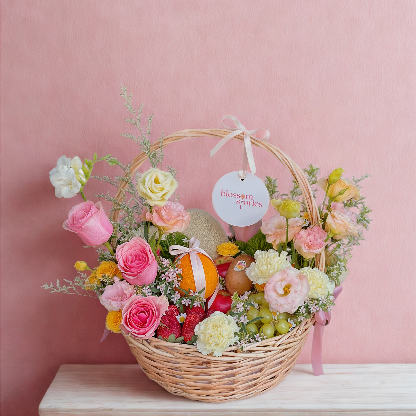 A mix of fresh flowers and handpicked seasonal fruits arranged in a rattan basket, perfect for gifting or simply brightening someone’s day.