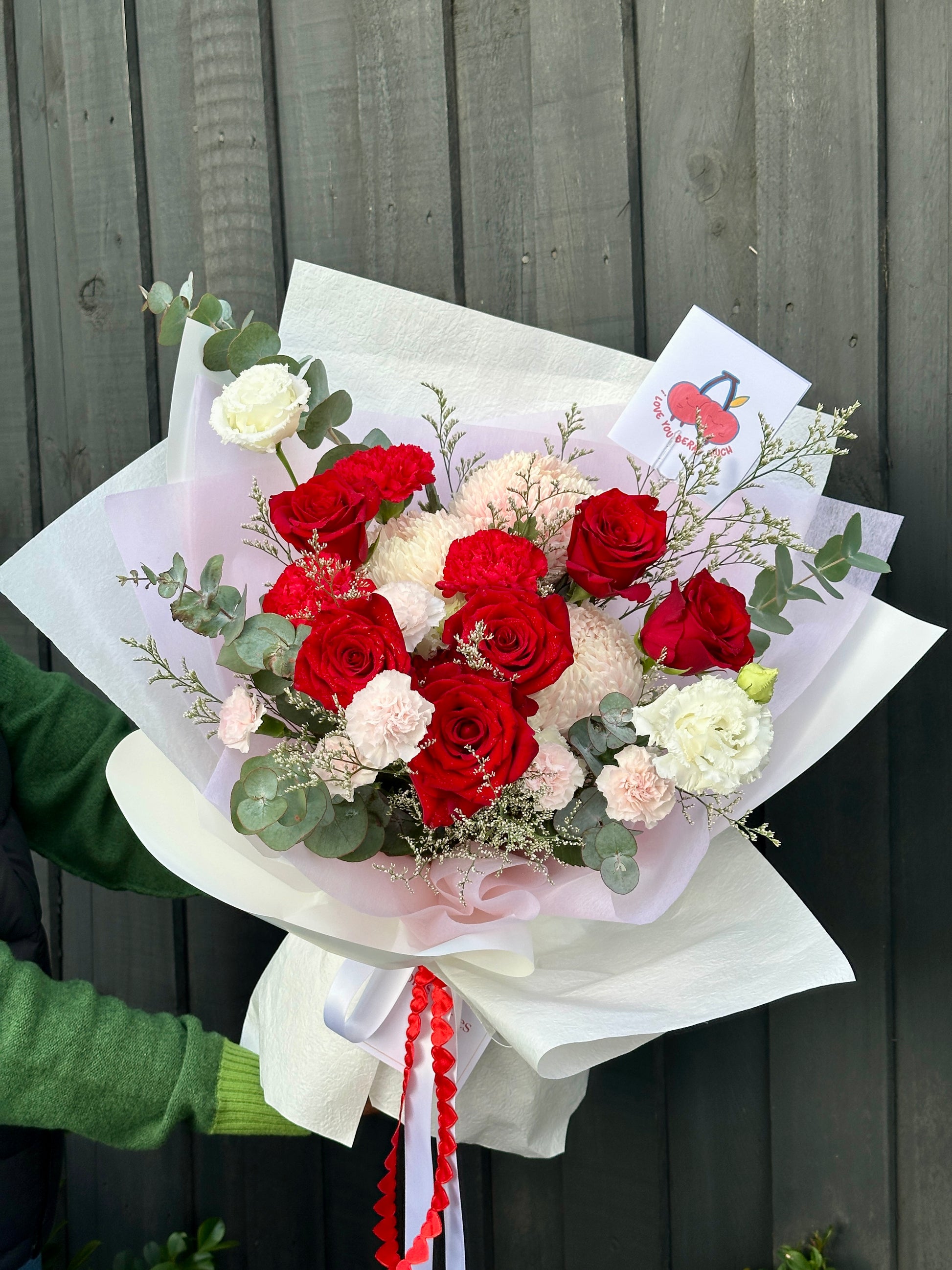 A symphony of elegance in bloom! This bouquet features lush Red Roses paired with soft, seasonal pink blooms, all wrapped in crisp white paper and finished with a silky white satin ribbon. The perfect way to celebrate love, special moments, or simply brighten someone’s day.